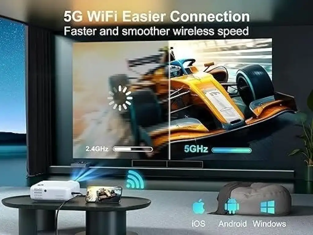 [5G WiFi ve 5.2 Bluetooth Bağlantısı] 5G ve 2.4G Çift Bantlı WiFi işlevi sayesinde WiFi ve Bluetooth özellikli projektör diğer tek bantlı projektörlere göre daha hızlı kablosuz hız, daha geniş aralık ve daha akıcı iletim sağlar. 5 saniyeden kısa sürede bağlanır. Daha kararlı ve daha hızlı hıza sahip yükseltilmiş Bluetooth çipi çeşitli Bluetooth hoparlörleri bağlamayı kolaylaştırır. İster evde ister dışarıda daha iyi sesin keyfini çıkarabilirsiniz