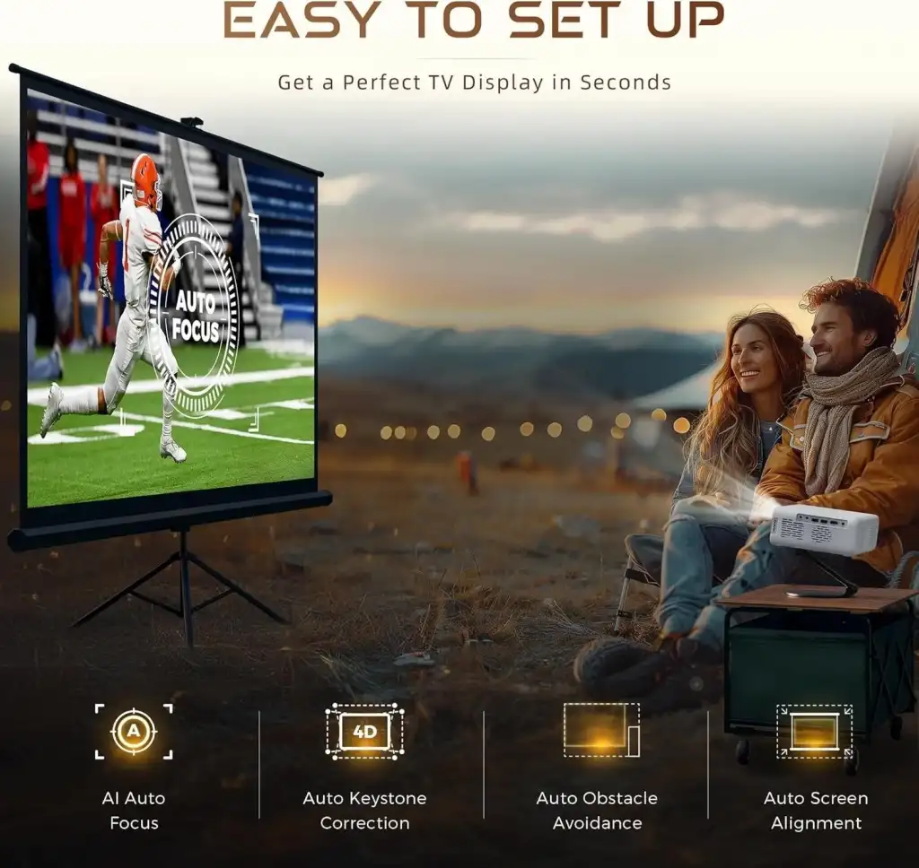 Kurulumu Kolay - Gerçek bir akıllı projektör olan Aurzen Eazze D1, Otomatik Yardım Özellikleri (Otomatik Odaklama, Otomatik Keystone Düzeltme, Otomatik Ekran Hizalama ve Otomatik Engelden Kaçınma) ile saniyeler içinde 200 inçe kadar mükemmel bir dikdörtgen ekrana ulaşmanızı sağlar. Ayrıca, bu taşınabilir projektör ihtiyaçlarınıza uyacak şekilde ekran boyutunu %50 ile %100 arasında ayarlamanıza olanak tanıyan bir yakınlaştırma işlevine sahiptir.
