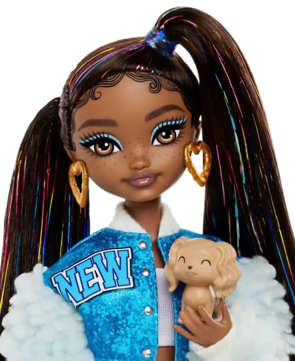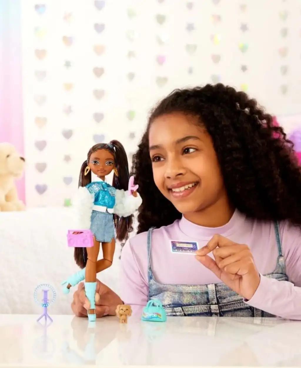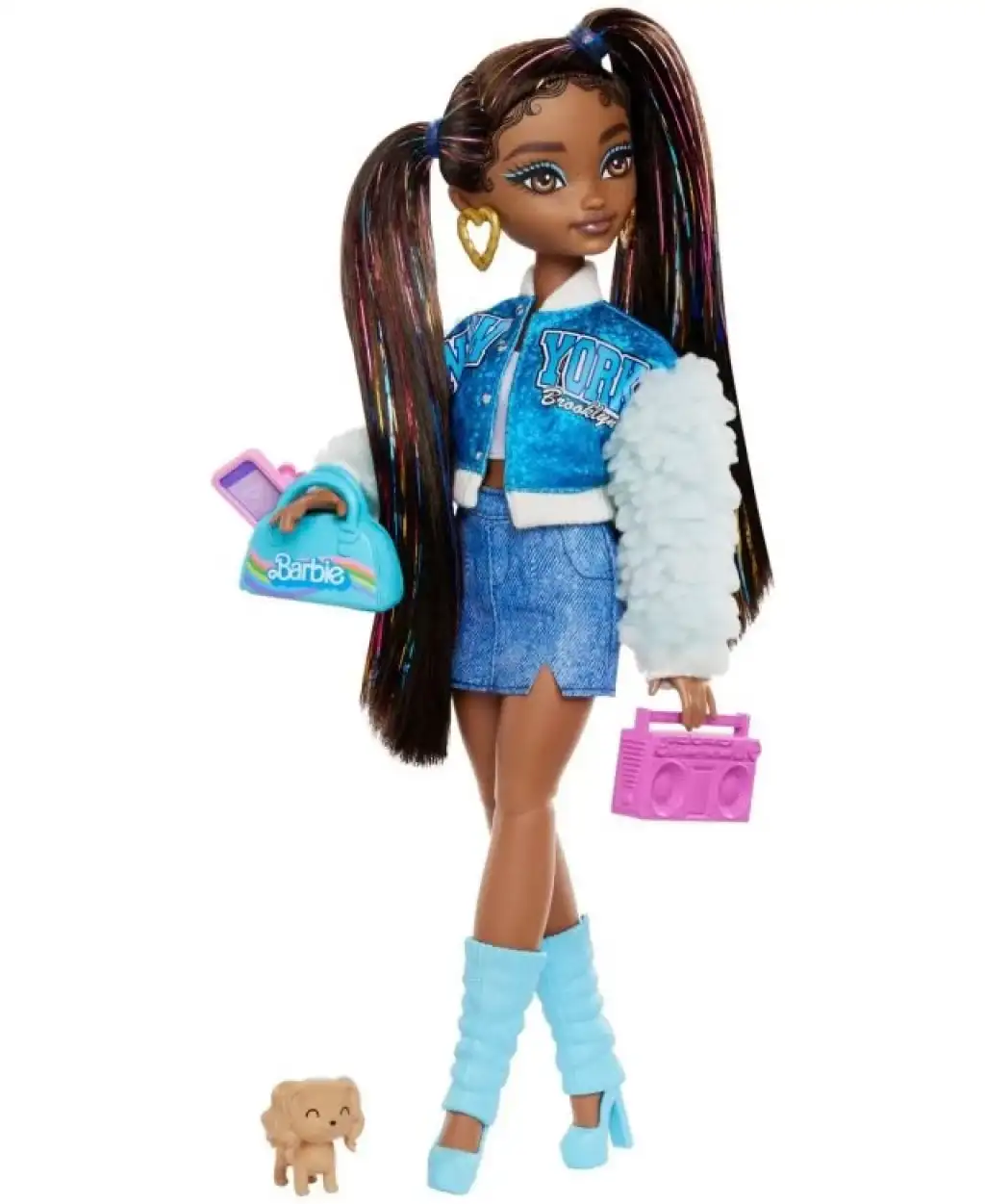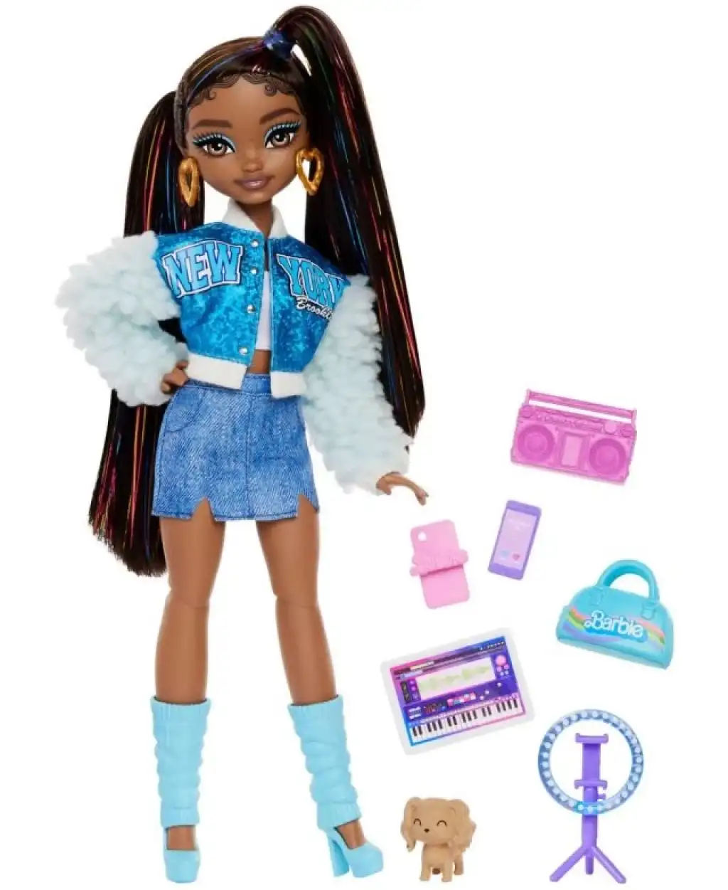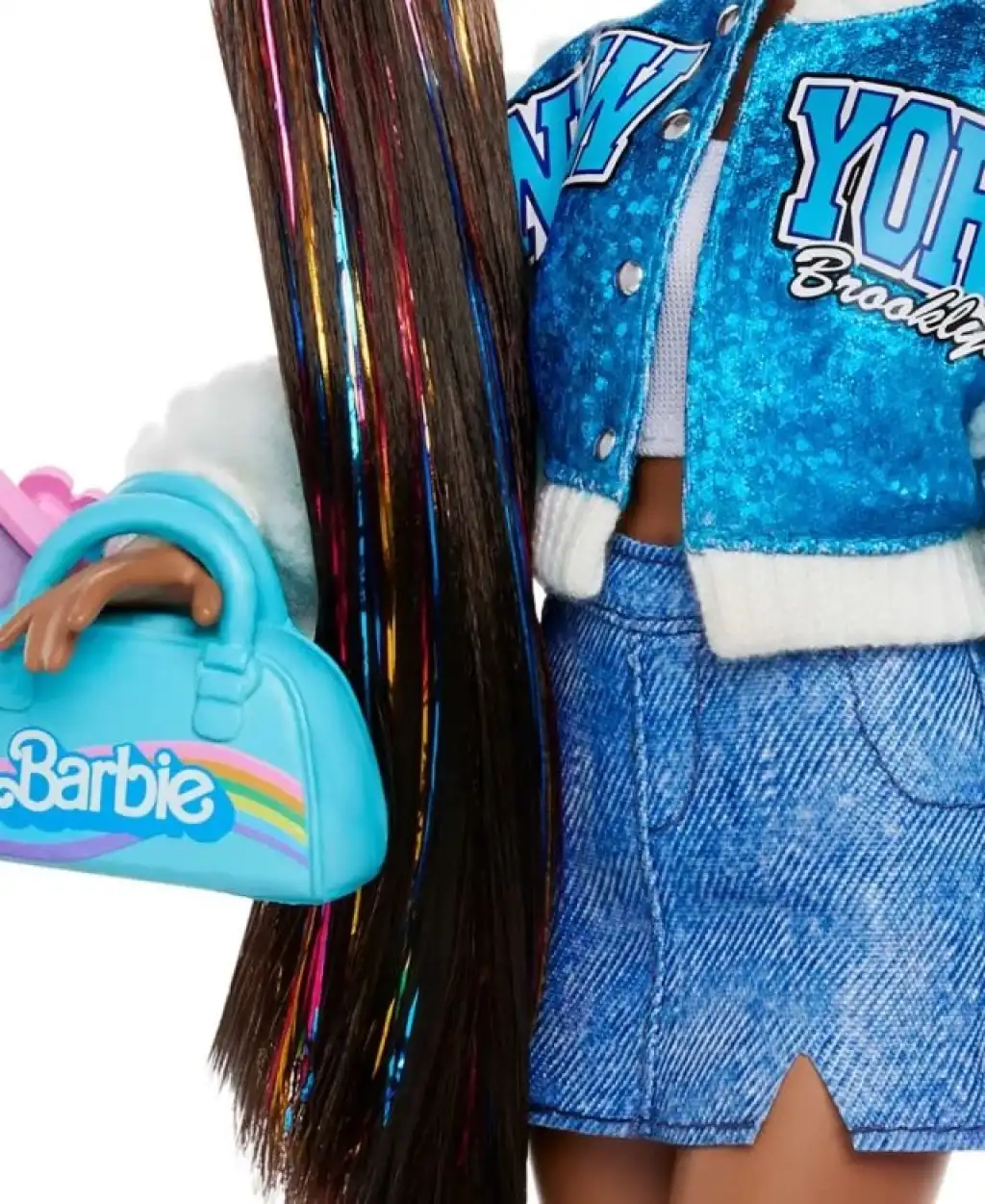 1 adet Barbie Dream Besties Barbie 'Brooklyn' bebek, ceket, denim etek, bacak ısıtıcıları ve ayakkabılar ile birlikte gelir.