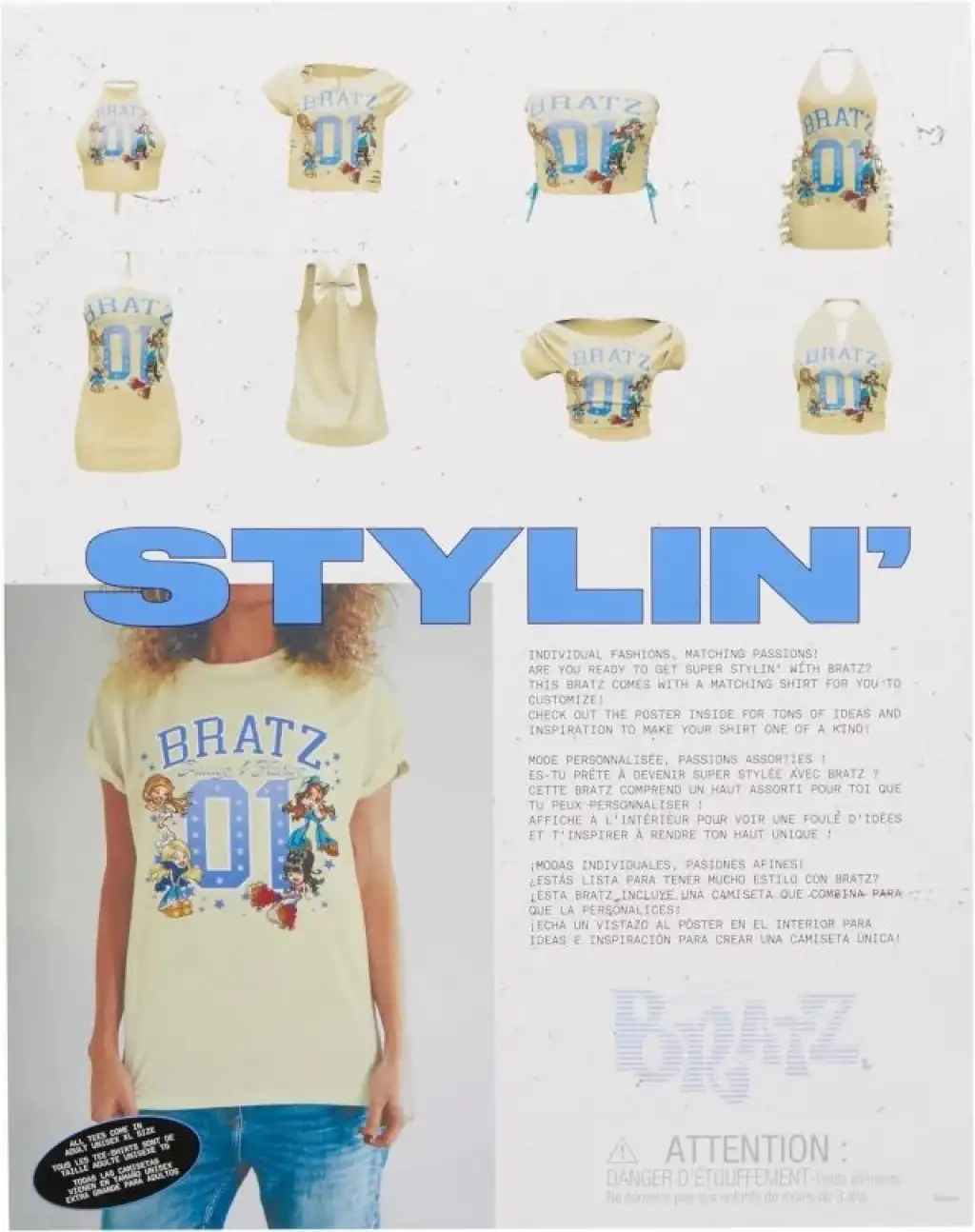 İÇERİR: 1 Bratz Stylin' Bebek, 1 atlet tişört, 1 gömlek, 1 etek, 1 çanta, 1 güneş gözlüğü ve 1 fırça - ayrıca bebeğinizle kişiselleştirmeniz ve eşleştirmeniz için yetişkin XL grafikli bir tişört