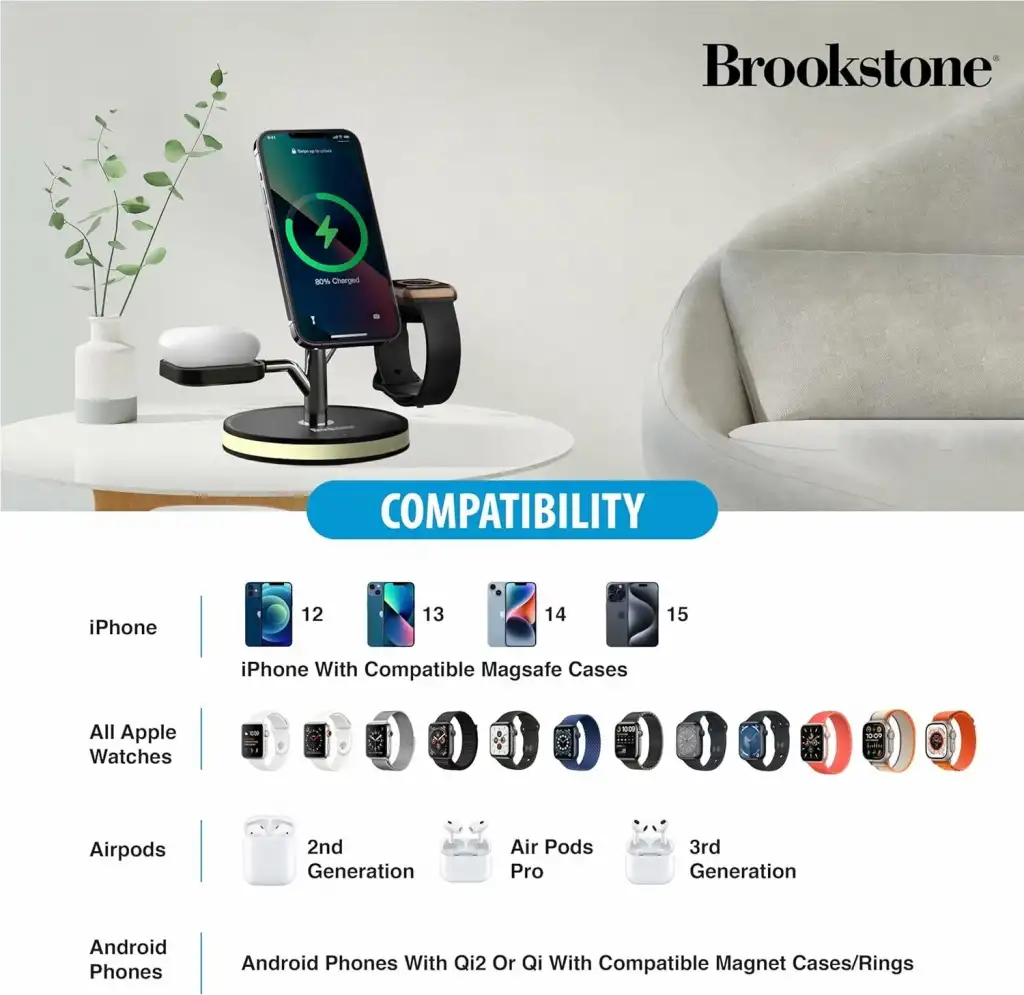 Brookstone 3-in-1 Wireless Fast Charging Station Magnetic Charger Stand for Multiple Devices Compatible with Apple iPhone Watch & Wireless AirPods, 15, 14, 13, 12, 11 Pro, Series 5, 6, 7, 8, 9, Ultra