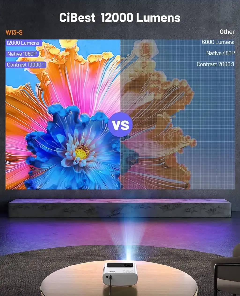 Mini Projector, 2023 Upgraded CiBest 1080P Full HD Portable Projector, 12000L Outdoor Projector for Home Theater Movie Projector, Projector 4K Compatible with HDMI, VGA, USB, TV Stick, Laptop