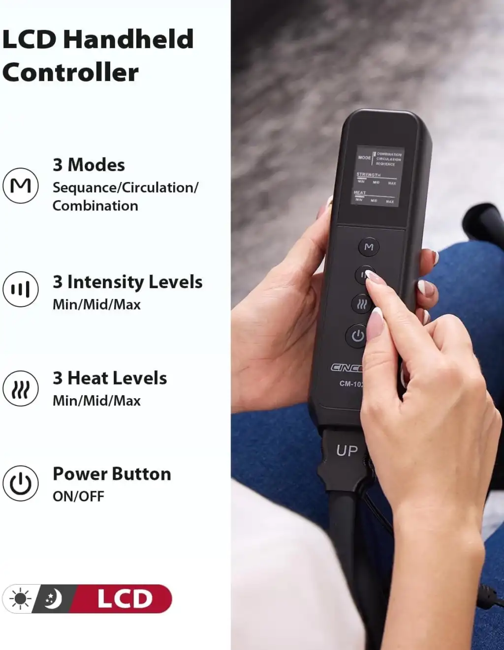 Şık ve Taşınabilir Tasarım - Geliştirilmiş LCD kontrol ünitesi, net talimatlar ve sezgisel düğmelerle kullanımı kolaydır ve geceleri rahatça okunabilir. Fermuarlı tasarımı, özellikle yaşlılar bu hava basınçlı bacak masaj cihazını kullanırken cihazı takıp çıkarmayı kolaylaştırır. Kolay saklama ve spor salonuna veya ofise taşıma için bir seyahat çantası dahildir.