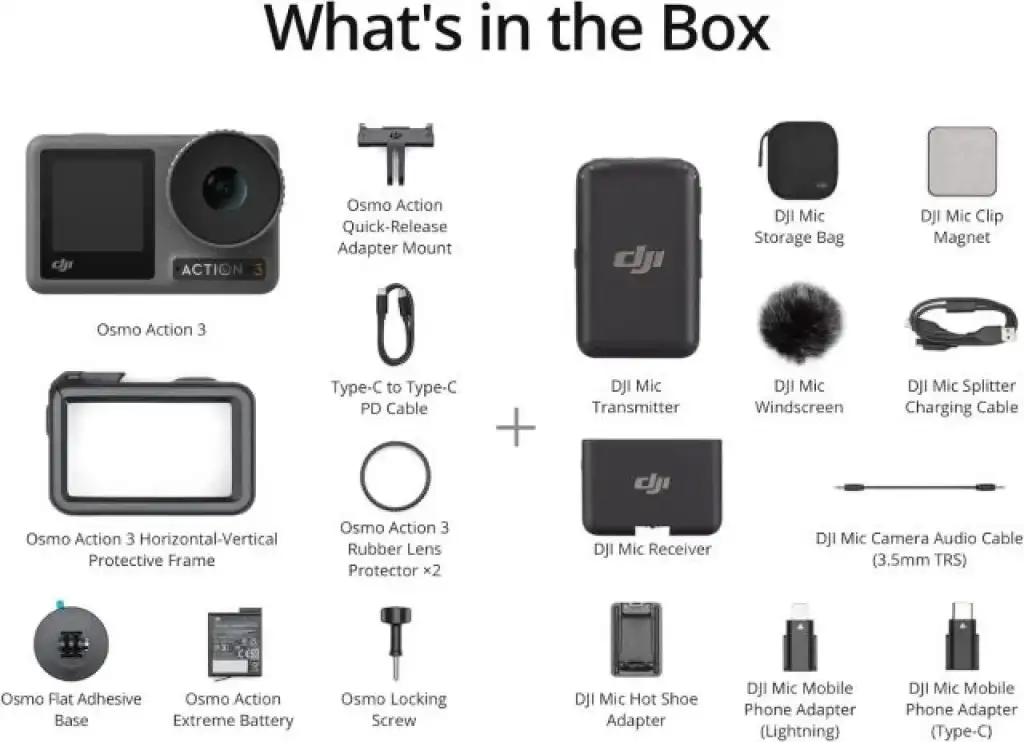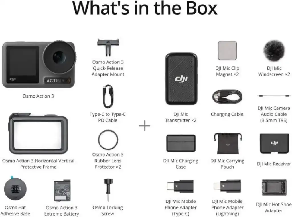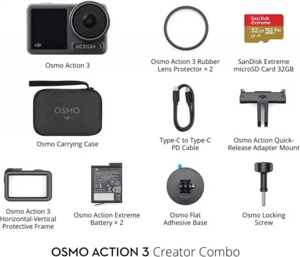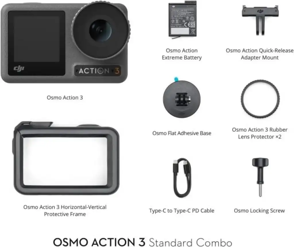 DJI Osmo Action 3 Standart Kombo - DJI Osmo Action 3 kameranın yanı sıra koruyucu çerçeve, adaptör montajı ve dinamik ve çeşitli senaryolar için gerekli diğer temel unsurları içerir.