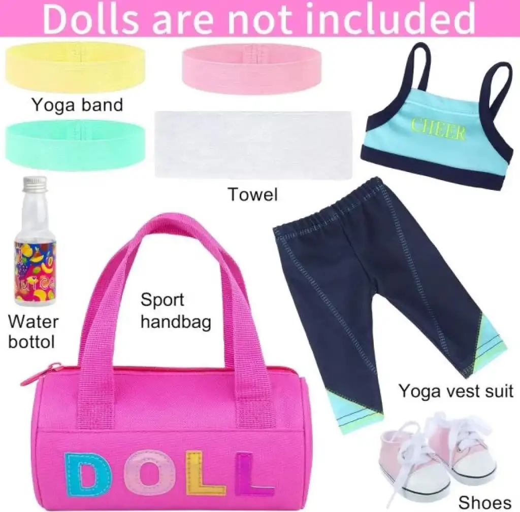 Paket içeriği: Moda 18 inç kız bebek yoga spor kıyafetleri 8 ürün seti - Yelek takımı, ayakkabılar, spor çantası, yoga bandı, havlu, su şişesi (Pls lütfen bebeklerin dahil olmadığını bilin)
