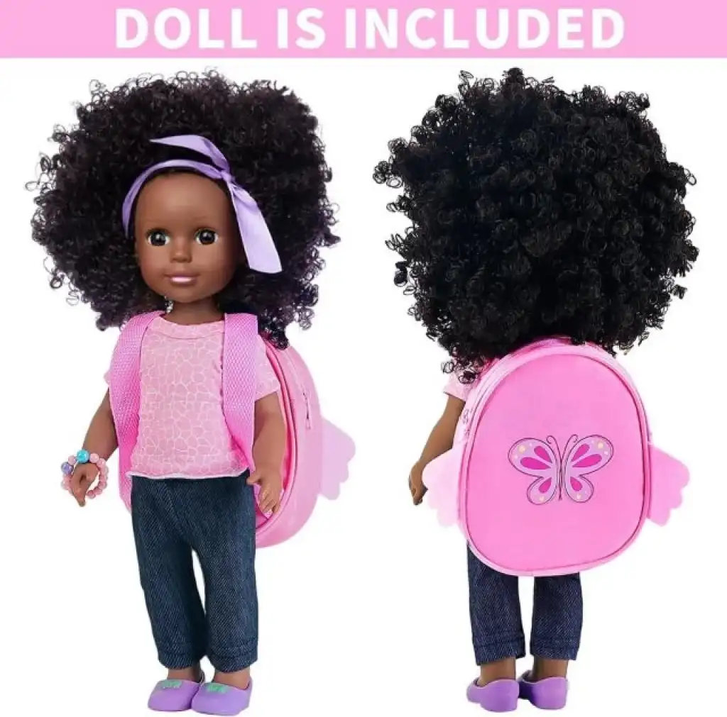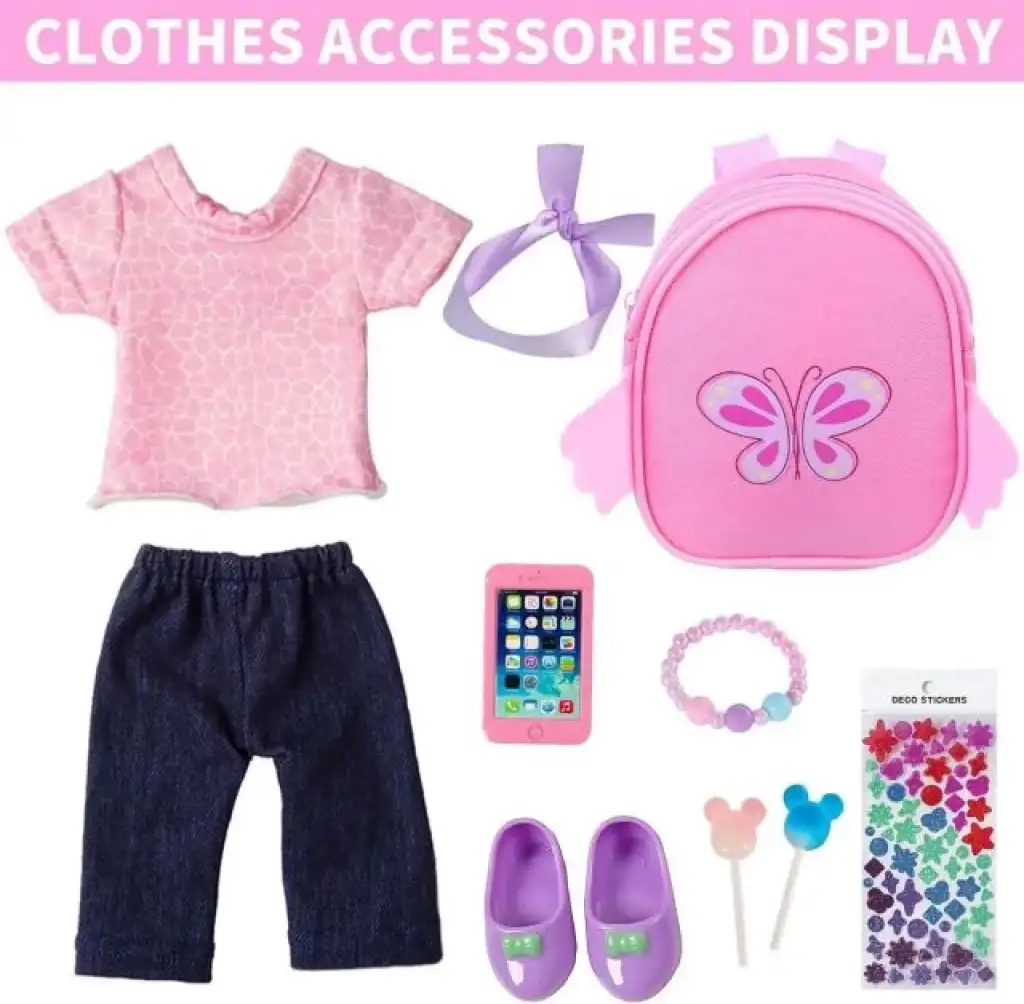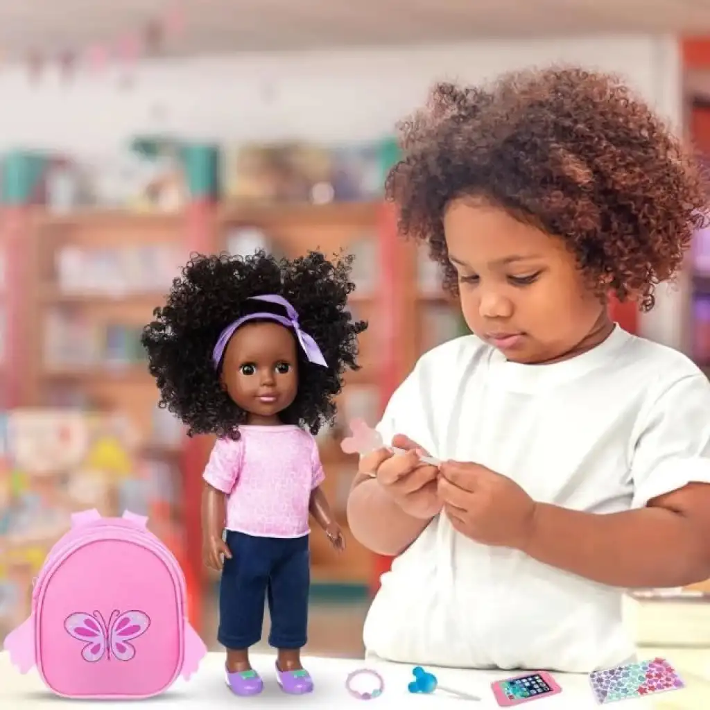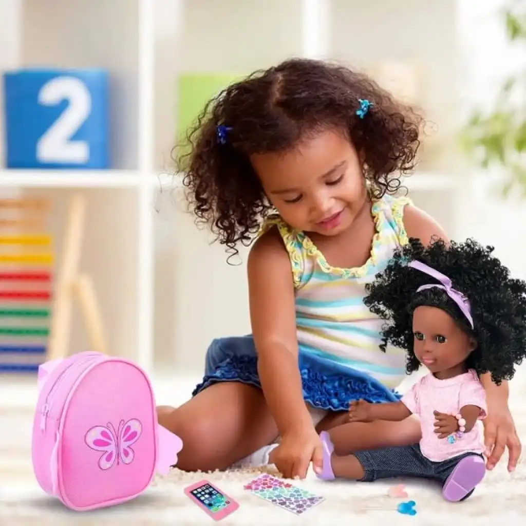 Çeşitli Oyuncak Bebek Aksesuarları: Bu sevimli siyah kız bebek, pembe bir üst ve kot pantolon, kafa bantlı ve uyumlu bir çift mor ayakkabı giymiş. Sevimli sırt çantasını taşıyabilir ve oynamak için en sevdiği pembe bilekliği, çıkartmaları, sevimli lolipopu ve oyuncak cep telefonunu yanına alabilir.