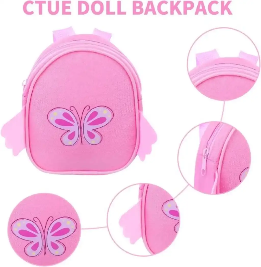 Ne Alırsınız: 1 adet 36Cm bebek bebek, 1 adet Pembe Üst ve Kot Elbise seti, 1 adet Bebek Sırt Çantası, 1 çift Mor Ayakkabı, 1 adet Oyuncak Telefon, 1 adet Bileklik, 1 adet Çıkartma, 2 adet Ayı Şekilli Lolipop, 1 adet Mor kafa bandı.