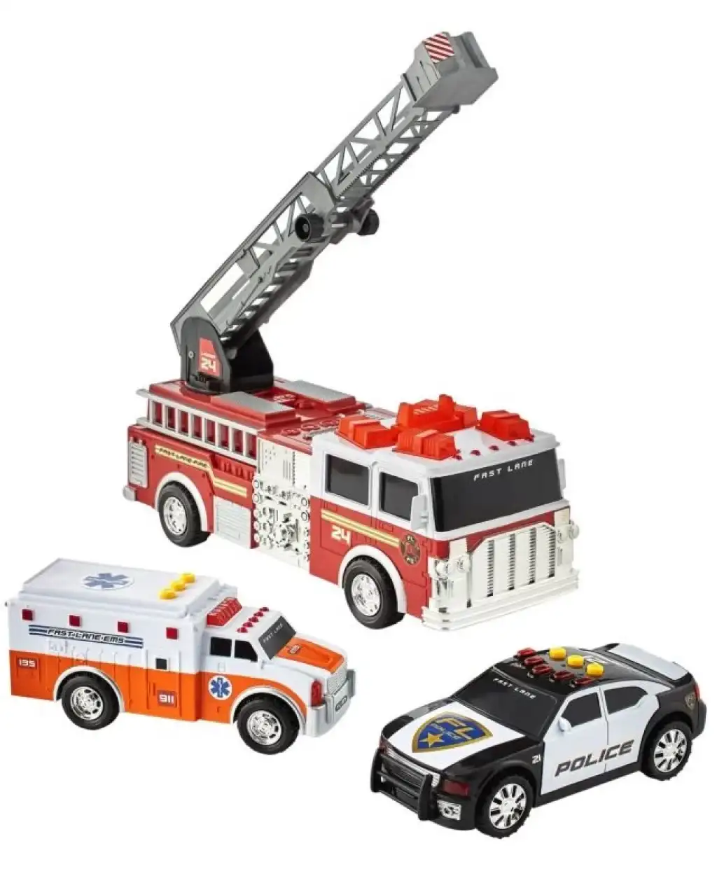 Fast Lane acil araç seti, 3 adet amacarlı kurtarma aracı içerir: bir itfaiye aracı, bir ambulans ve bir polis aracı. Her araç, gerçekçi ışık ve ses özellikleri ile donatılmıştır.