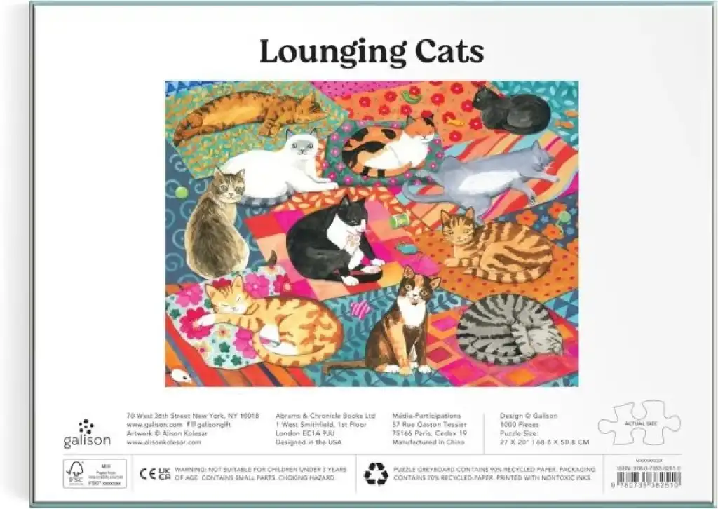 1.000 PARÇALI PUZZLE: Eğlenceli bir meydan okuma olan bu puzzle, günlerce renkli eğlence sunar. MUHTEŞEM DETAYLAR: Bu parlak ve renkli puzzle, el yapımı kumaşlar ve ev bitkileriyle dolu bir cennette yan yana yuvalanmış iki sevimli kedinin yer aldığı bir rahatlık resmidir. KOLAY KULLANIM: 1000 şerit kesim puzzle parçası kalın ve sağlamdır. Tamamlanan puzzle 20" x 27" ölçülerindedir. SAĞLAM SAKLAMA KUTUSU: 8" X 8" X 1,5" mat kaplamalı saklama kutusu, tamamlanmış puzzle resmini gösterir ve parçaları güvenli, bir arada ve zarar görmemiş halde tutmak için ideal bir yerdir. Ayrıca harika bir hediye olur. SÜRDÜRÜLEBİLİR STANDARTLARA UYGUN YAPILMIŞ BULMACALAR: Puzzle %90 oranında geri dönüştürülmüş kağıt içerir. Bunun yanı sıra ambalaj da %70 oranında geri dönüştürülmüş kağıt içerir ve sorumlu bir şekilde FSC sertifikalı malzemeden yapılmıştır. Toksik olmayan mürekkeplerle basılmıştır.