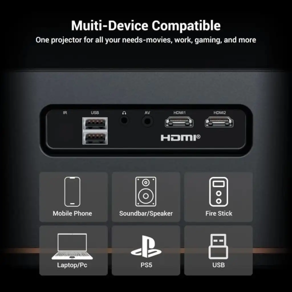 ÇOKLU GÖRÜNTÜLEME SEÇENEKLERİ: Projektör, HDMIx2, USBx2, AV ve 3,5 mm kulaklık girişiyle donatılmıştır; bu sayede TV stick'ler, Chromecast, Roku, telefon, ISO/Android, PC, Dizüstü Bilgisayar, PS4, PS5 ve daha fazlasıyla uyumlu olup çeşitli ihtiyaçlara cevap verir. 300 inç ekran ve %50 yakınlaştırma işleviyle farklı alanlar için projeksiyon gereksinimlerini karşılar. Projektör, ev sinemaları, arka bahçede film geceleri, oyun, yoga, doğum günü partileri, müzik etkinlikleri vb. için mükemmeldir.