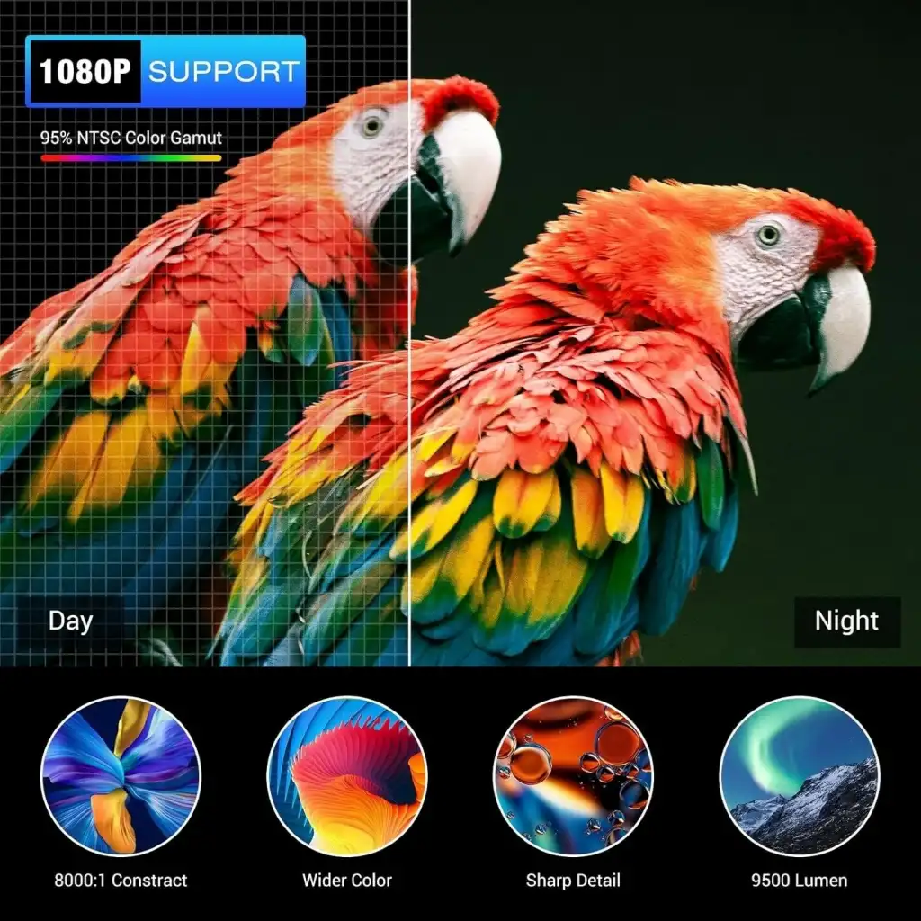 【1080p Destekli Projektör - Size Olağanüstü Görsel Deneyim Getirir】 HAPPRUN Mini Projektör, Gerçek Renk İçeriğini Geri Yüklemek İçin 1080p Desteği ve 8000:1 Yüksek Dinamik Kontrast Oranı Özelliklerine Sahiptir. %95 NTSC Teknolojisi ile Bu Ev Sineması Projektörü Size Gerçek, Dinamik ve Renk Canlılığı Olan Bir Projeksiyon Görüntü Kalitesi Sunar