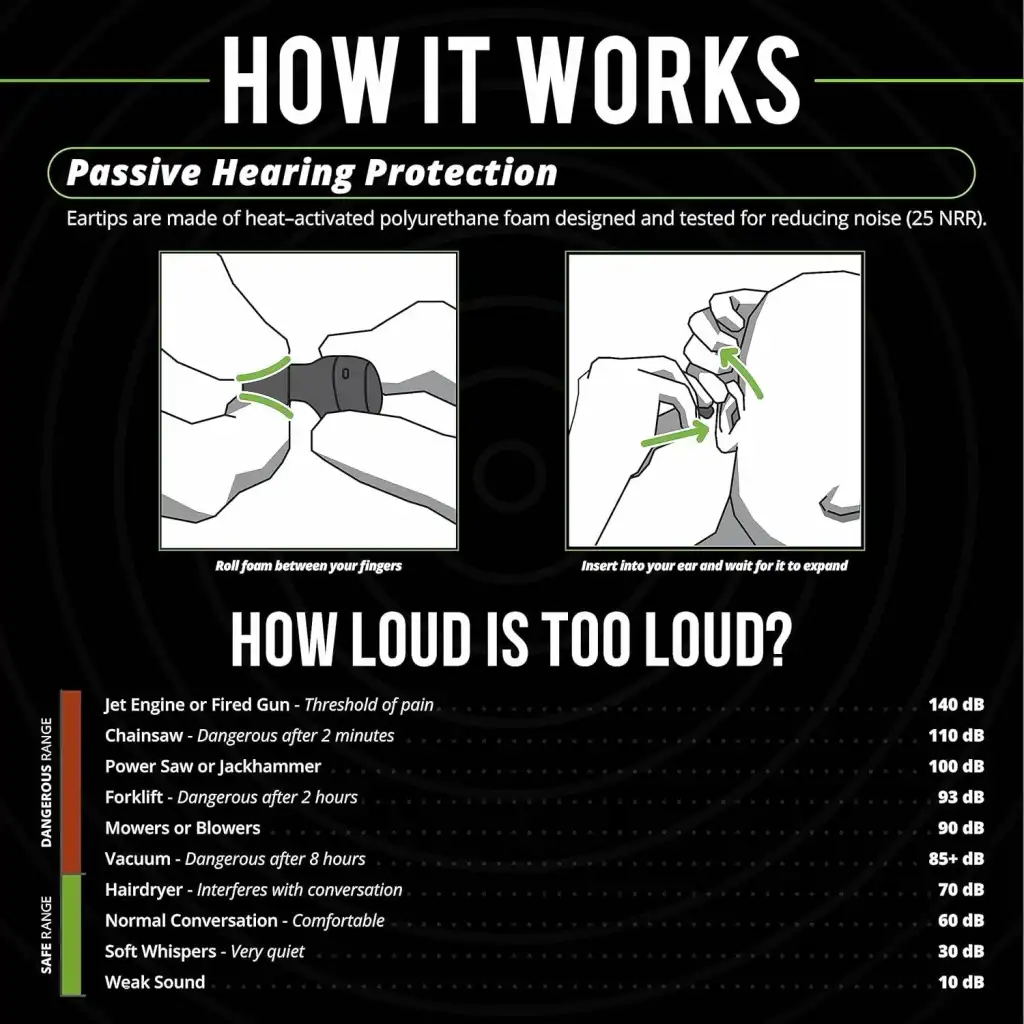 BLOK GÜRÜLTÜ: ısıyla etkinleşen hafızalı köpük kulaklık uçları, dış gürültüyü önemli ölçüde azaltmak için kulak tıkaçları gibi genişler. ANSI sertifikalı ve 25 dB Gürültü Azaltma Derecesi (NRR) ve 85 dB SafeMax Ses Sınırlayıcı ile OSHA uyumludur. 3 çift köpük kulaklık ucu (S,M,L) ve 3 çift çift silikon kulaklık ucu ile birlikte gelir.