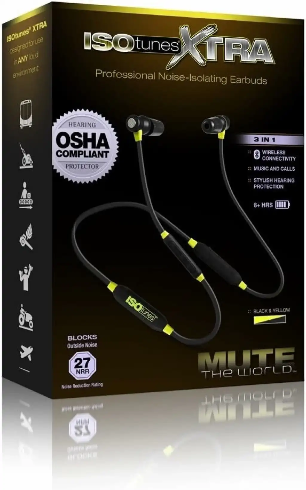 ISOtunes Xtra Bluetooth Earplug Headphones, 27 dB Noise Reduction Rating, 8 Hour Battery, Noise Cancelling Mic, OSHA Compliant Bluetooth Hearing Protector (Black & Yellow)