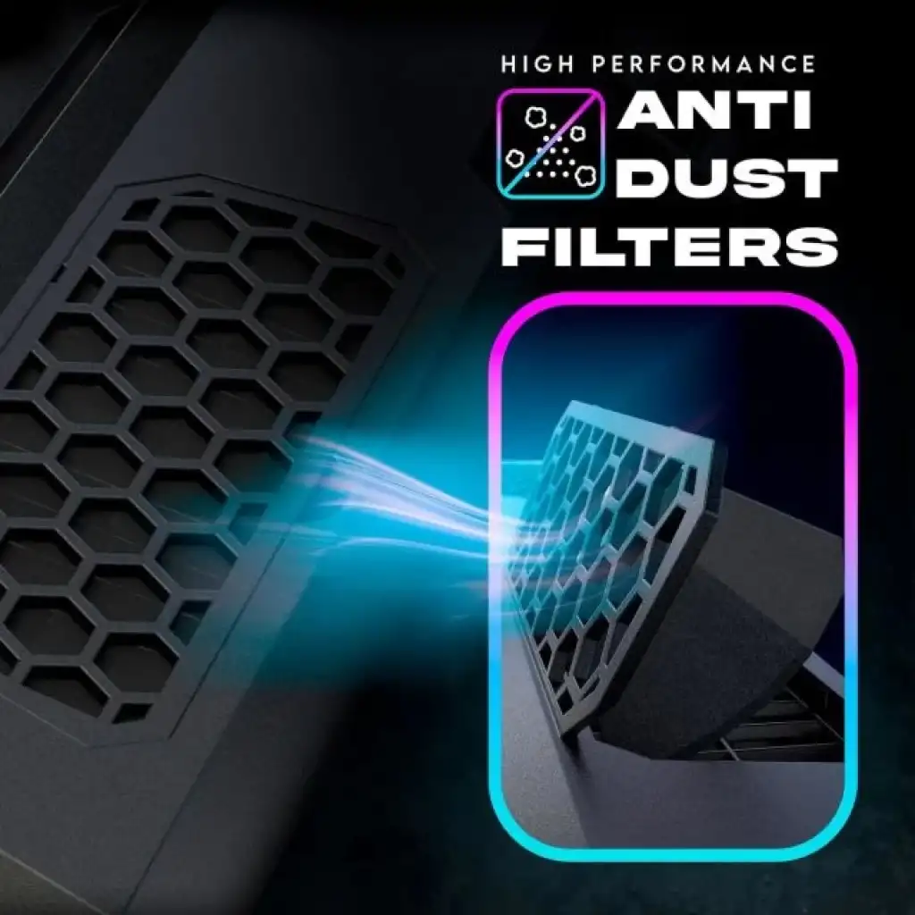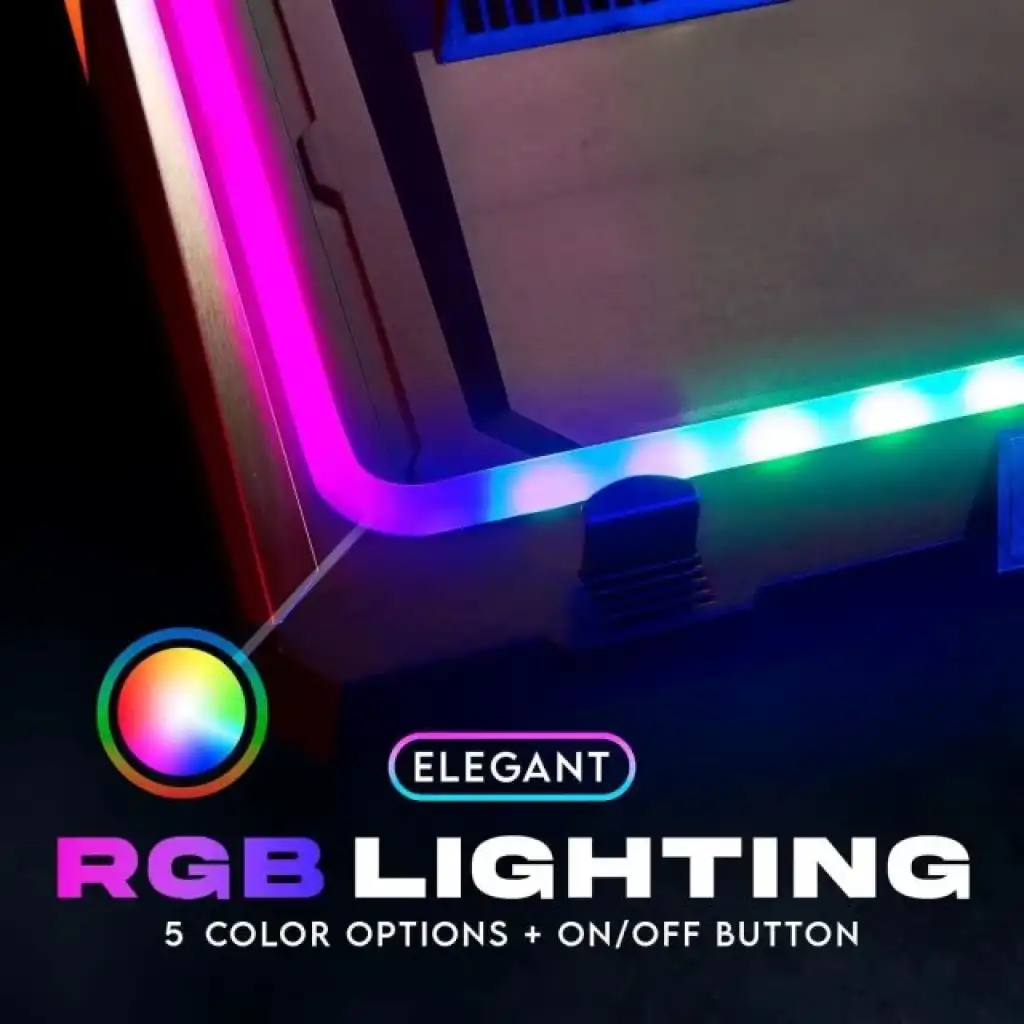 RAHAT KONTROLLER + ZARIF RGB AYDINLATMA: Soğutucunuzu daha iyi kontrol etmek için öndeki üç düğmeyi kullanın. Soğutucuyu başlatmak için sadece ON tuşuna basın ve SPEED tuşuna basarak tercih ettiğiniz fan hızını seçin. Mevcut 3 renk arasından seçim yaparak ön ve yan ışıkları özelleştirmek için LED düğmesini kullanın. Daha nötr bir görünüm tercih ediyorsanız, bunları tamamen devre dışı bırakmak için aynı düğmeyi basılı tutabilirsiniz. Rahat bağlantı ve genişletilmiş işlevsellik için YERLEŞİK EKSTRA USB BAĞLANTI NOKTASI.