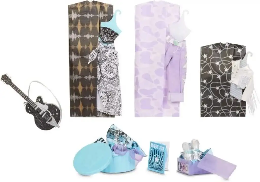 YENİDEN KARIŞTIRALIM : Lonestar'ın sahnede kendinden emin bir şekilde performans sergilerken yanında getirdiği 2 adet country moda kıyafeti var. BFF, LOL Surprise OMG Honeylicious bebeğiyle modaları karıştırıp eşleştirin. Ayrıca tıngırdatabileceği siyah akustik gitarı da var.