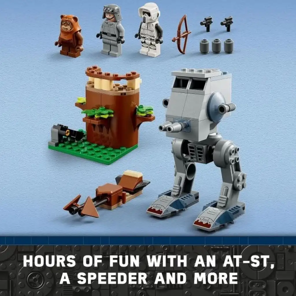 Çeşitli Mini Figürler - Ok ve yaylı Wicket the Ewok, bir Scout Trooper ve her biri oyun eğlencesi için bir blaster içeren bir AT-ST Sürücüsü LEGO minifigürü içerir.