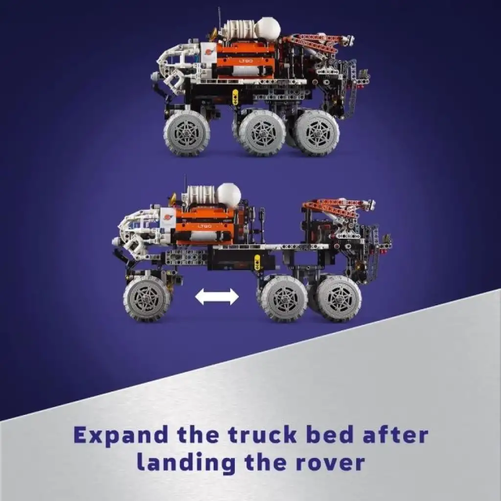 Özelliklerle dolu bir uzay oyuncağı – Bu uzay yapım oyuncağı, genişleyen bir kamyon yatağı, süspansiyon, hareketli bir vinç, asansör, jeneratör, işaret lambaları, yardımcı gezici, yaşam alanları ve kokpit içerir