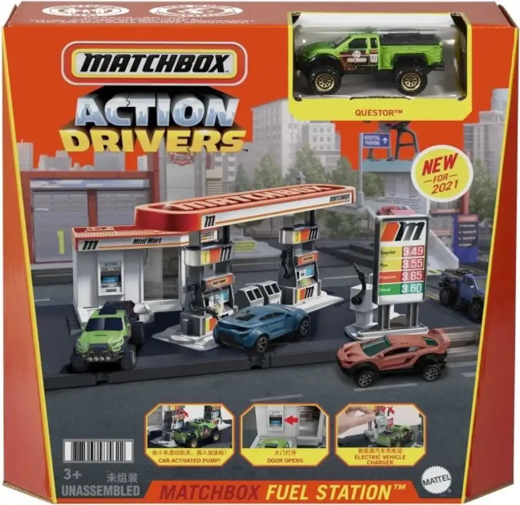 Matchbox Aksiyon Sürücüleri Matchbox Akaryakıt İstasyonu Oyun Seti, çocukların itip kakma oyunlarda tanıyacağı ve taklit etmekten keyif alacağı, gerçek hayattaki bir benzin istasyonunun tüm özelliklerine sahiptir.