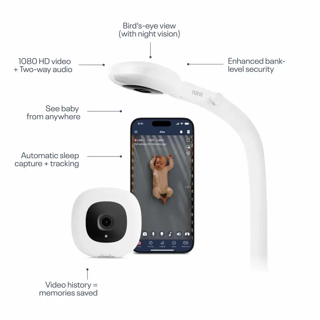 Nanit Essentials Smart Baby Monitor with Floor Stand – 1080p HD Wi-Fi Camera, Sensor-Free Breathing Monitoring, Sleep Tracking, Two-Way Audio, Night Vision, Motion & Cry Notifications, White