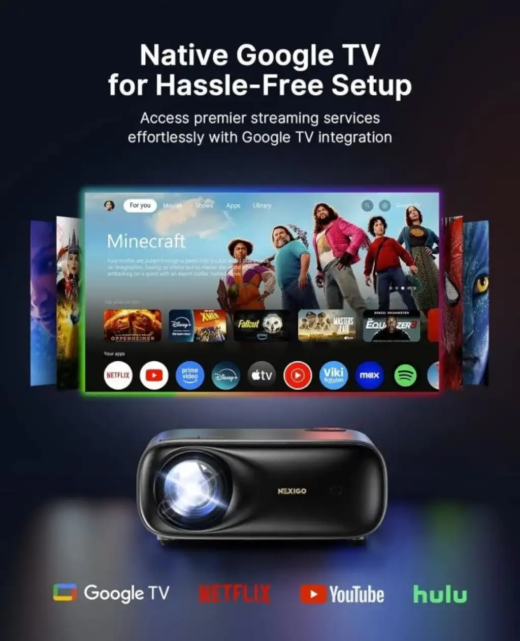 Sınırsız Eğlence: NexiGo PJ40 Ultra Projektör, Netflix, YouTube ve Prime Video için resmi lisanslarla birlikte gelir. Ek cihaz veya abonelik gerektirmeden, kutudan çıkar çıkmaz geniş bir içerik yelpazesinin keyfini çıkarın. Tek bir projektörle oturma odanızı tam teşekküllü bir eğlence merkezine dönüştürün.