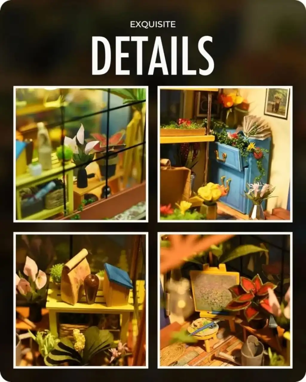 SEVİMLİ MİNİ BEBEK EVİ SETİ: Tüm mobilya ve aksesuarlar, benzer malzemeye sahip gerçek evle neredeyse aynı. Çok tatlı ve güzel. Çizim masası, pencere, perde, çalışma masası, raf, bitkiler dahildir. 1:24 ölçekli, tamamlanmamış kit. Renkli Talimat, her adımda size nasıl monte edileceğini gösteren resimler vardır.