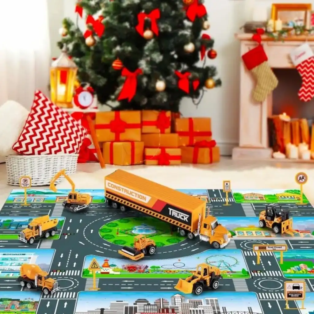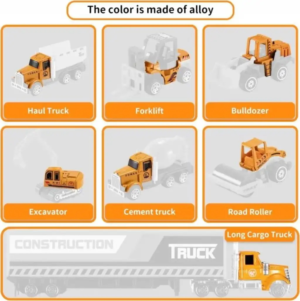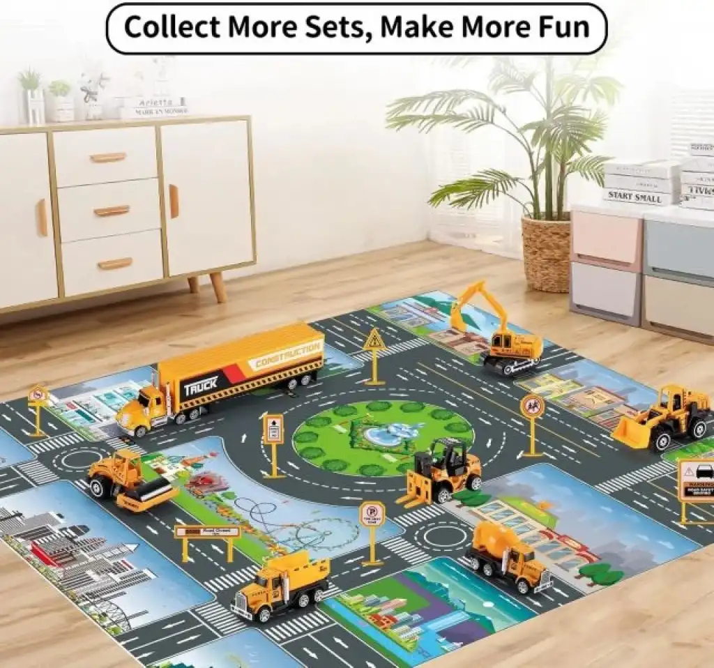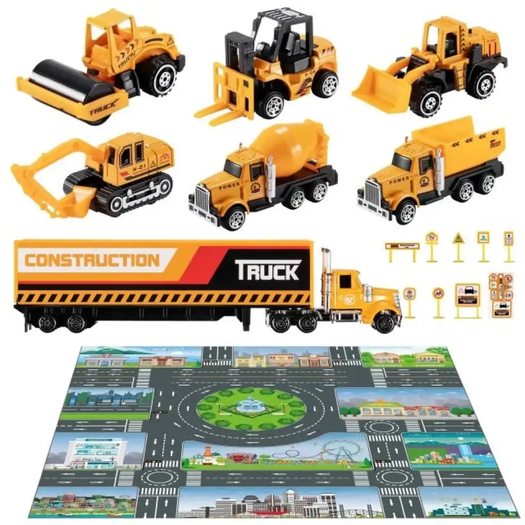 ÇOCUK İNŞAAT ARAÇ OYUNCAK SETİ - 1 x katlanabilir oyun minderi, 1 x çok fonksiyonlu taşıma arabası, 1 x forklift, 1 x buldozer, 1 x yol silindiri, 1 x ekskavatör, 1 x çimento kamyonu, 1 x damperli kamyon ve 1 x yol işaretleri seti. 3 yaş ve üzeri çocuklara sonsuz mutlu zamanlar yaratmaları şiddetle tavsiye edilir!