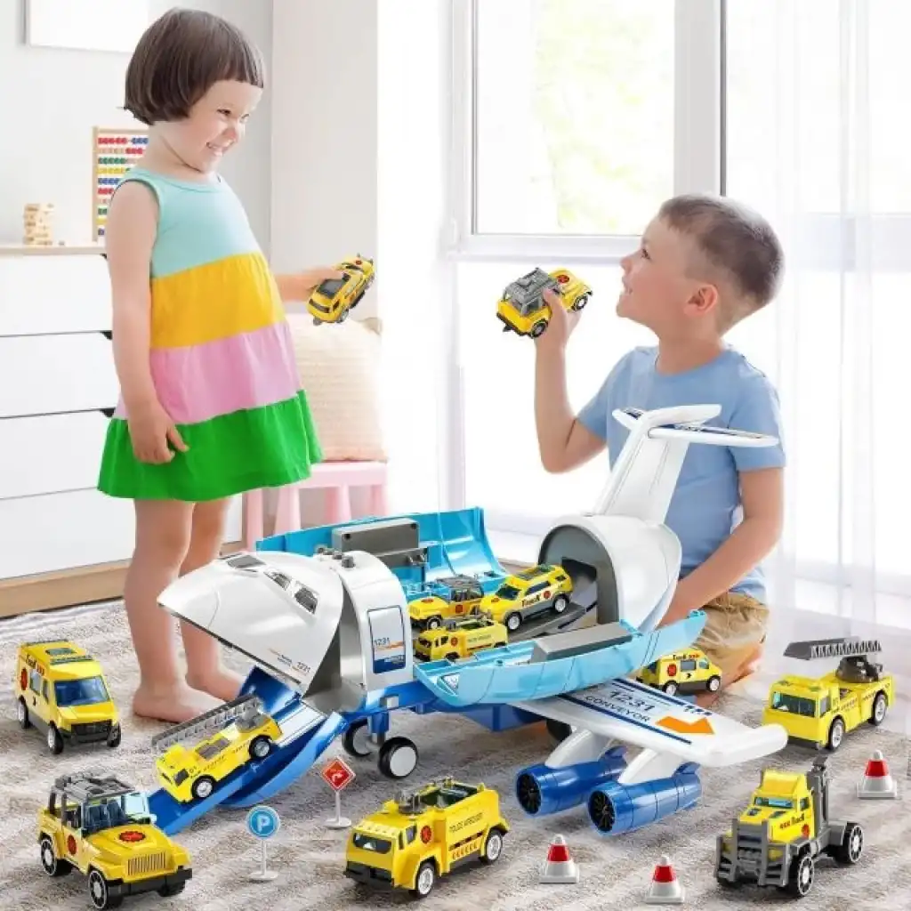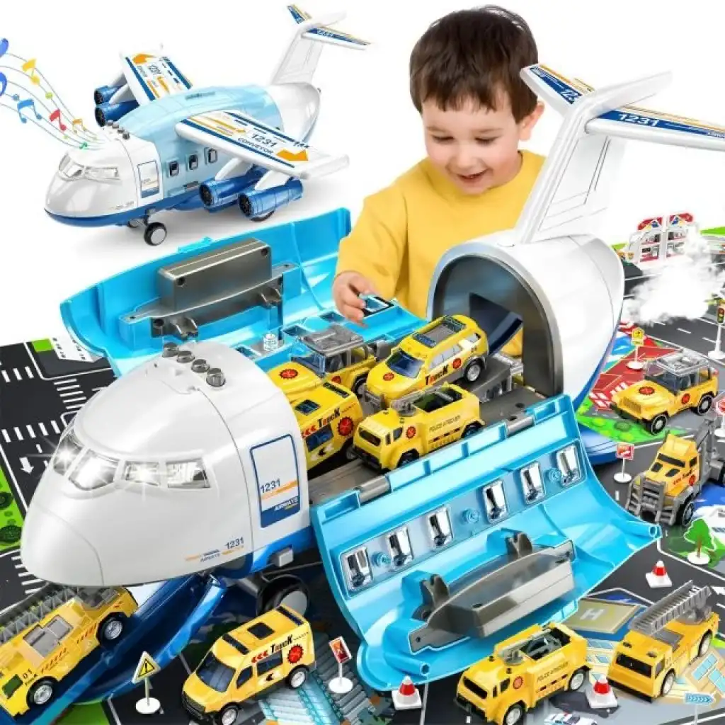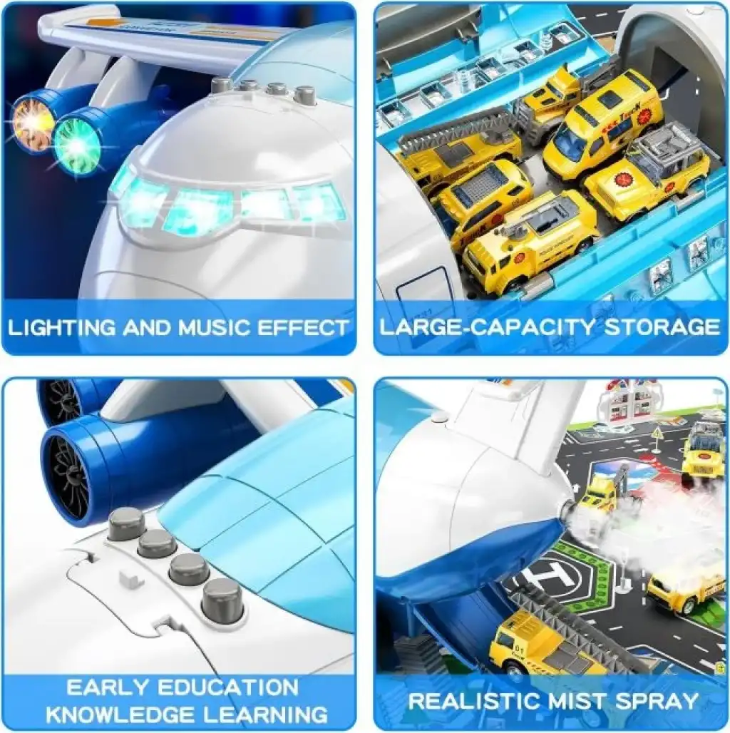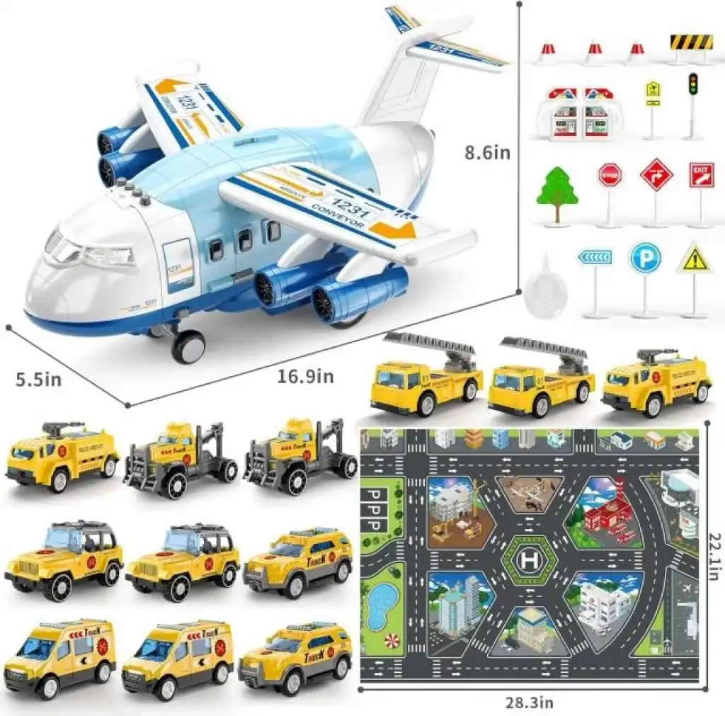 Süper Değerli Oyun Seti - Toplam 20 parça oyuncak setinde büyük bir uçak ve 6 mini iş makinesi/(itfaiye aracı) ile diğer aksesuarların kombinasyonu, çocuğunuza ayrı bir oyundan daha fazla eğlence getirecek. Şimdi uçak ve arabaların çifte eğlencesini deneyimleyelim! Bol İşlevler - Uçağımızda, araçların kabinden dışarı kaymasına izin veren iki kızak rayı vardır ve uçağın dışında, arabaların ileri veya geri kaymasını kontrol etmek için kalkış kontrol düğmesi vardır. Atalet kayma tasarımı, uçağın itildikten sonra düz yüzeylerde uzun mesafe süzülmesini sağlar. Eşsiz Özellikler - Rakiplerle karşılaştırıldığında uçağımız, onu daha çok gökyüzünden geçen gerçek bir uçak gibi yapan simüle edilmiş buhar jeti işlevine sahiptir. Kalkış ses efektine eşlik eden sis spreyi oluşturmak için uçağın ön kısmına basın. Kabinin üzerindeki dört düğme farklı müzikler ve ışıklar yaratıyor. Gerekli 3x1,5V AA piller dahil değildir. Arabalar, Barikatlar ve Harita - 6 alaşımlı araba, sağlam ve dayanıklı, çocukların güvenliğini sağlayan yüksek kaliteli metal ve plastik malzemelerden yapılmıştır. Etkinlik sahne haritasına farklı barikatlar koyun, çocuklar üzerinde araç ve uçak oynayabilir ve trafik bilgisini deneyimleyebilir. Çeşitli Durumlar İçin İdeal Hediye - 3 4 5 6 yaşındaki kız ve erkek çocuklar için doğum günü, Çocuk bayramı, Noel günü vb. için mükemmel bir hediye. Çocuğun pratik yeteneklerini ve düşünme yeteneklerini geliştirebilen, hayal gücünü ve yaratıcılığı teşvik edebilen, tam olarak aradığınız en iyi seçimdir.