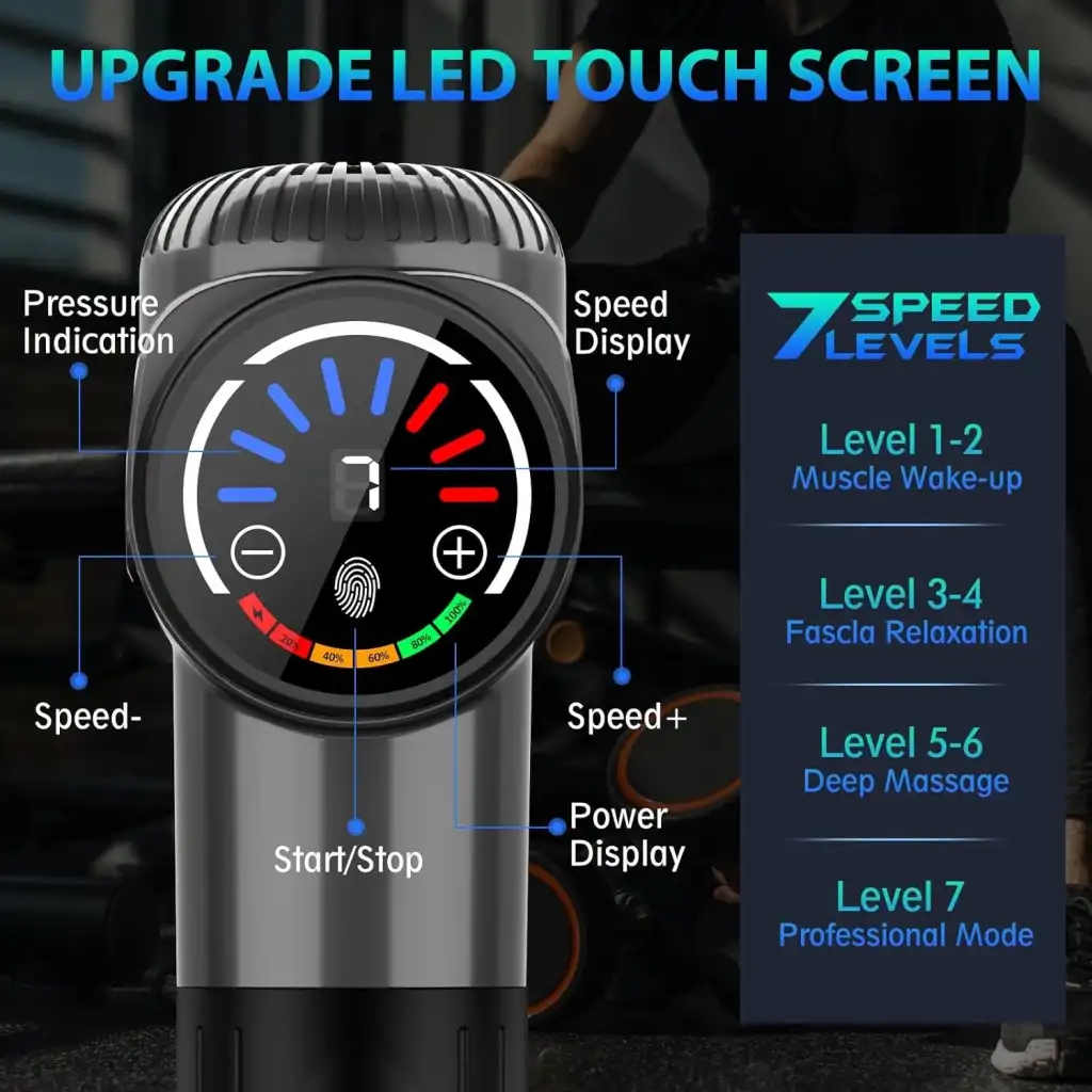 Akıllı LED Dokunmatik Ekran: Masaj tabancası, hız seviyesini kolayca ayarlamanıza ve kalan pil miktarını görmenize olanak tanıyan akıllı bir LED dokunmatik ekran tasarımı ve pil göstergesi ile donatılmıştır. TOLOCO'nun benzersiz akan ışık tasarımı da işlemi daha teknolojik hale getirir.