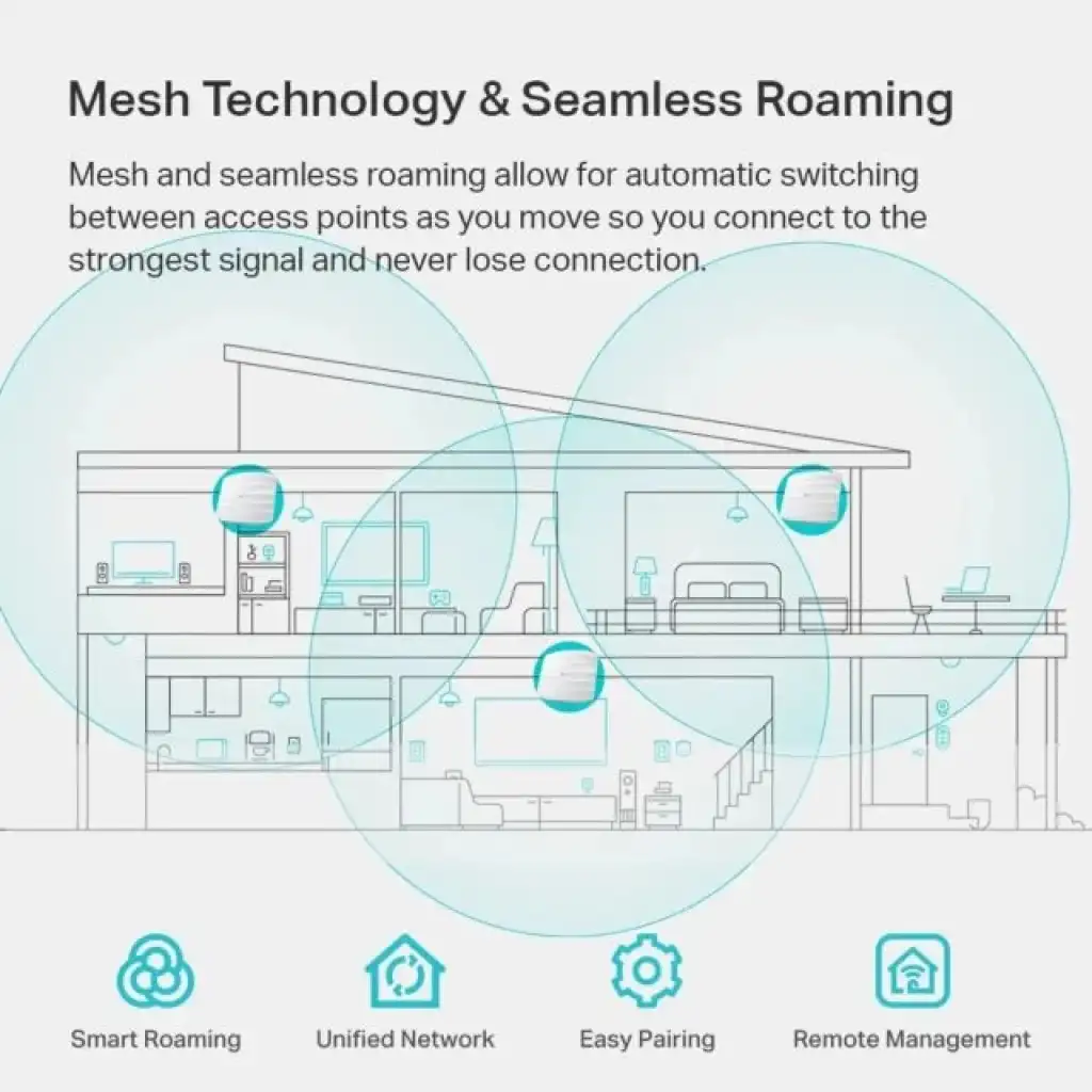• Gelişmiş Kablosuz Teknolojisi: Mesh WiFi, Kesintisiz Dolaşımı* (Omada Mesh ve Kesintisiz Dolaşım, Omada SDN denetleyicilerinin kullanılmasını gerektirir), WPA3, Bant Yönlendirme, Yük Dengeleme, Airtime Fairness ve Beamforming teknolojilerini destekler.