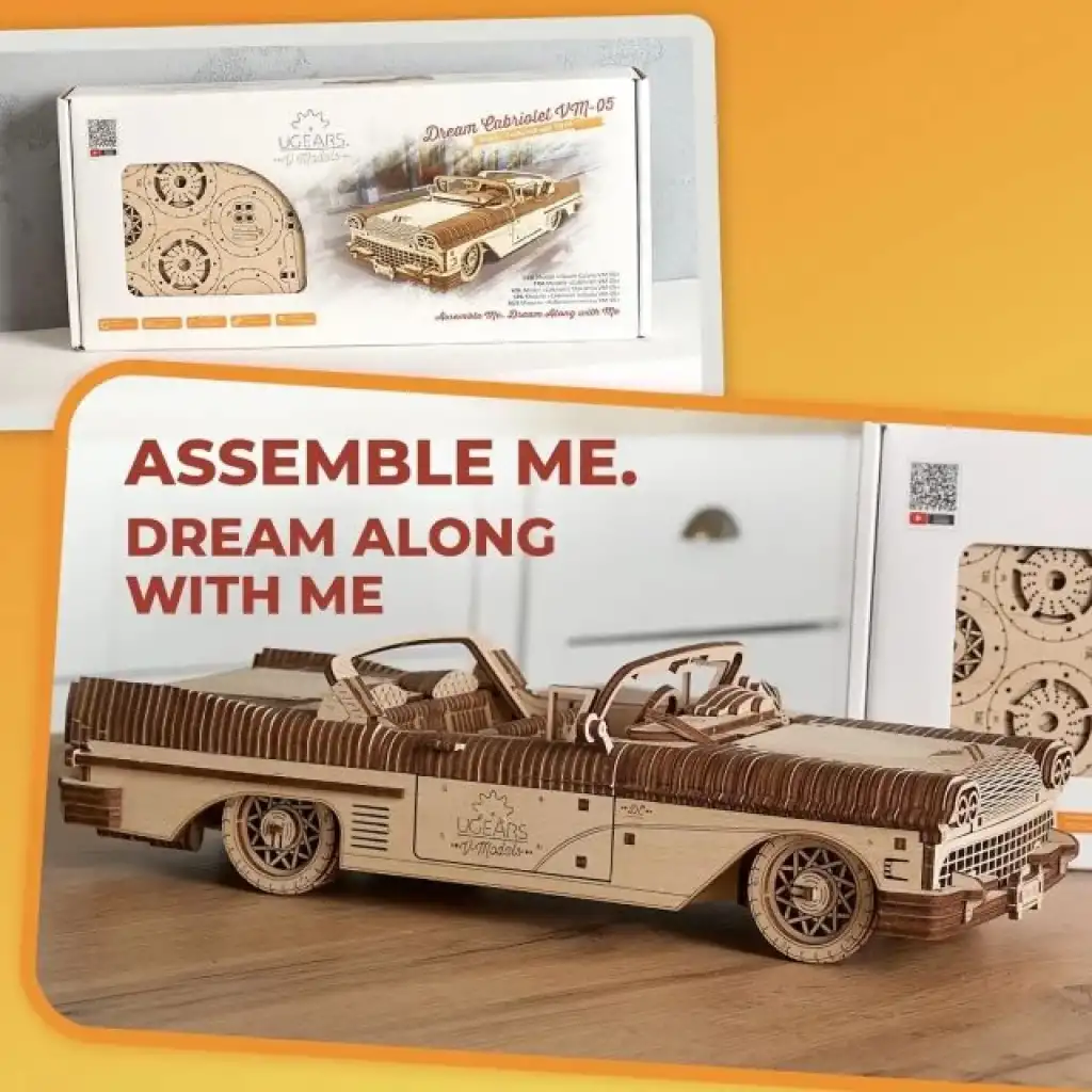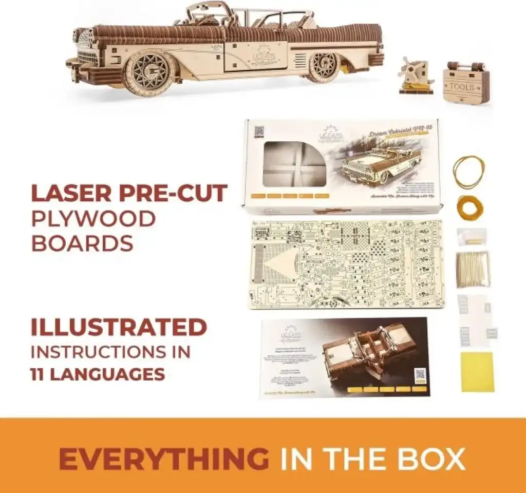 Model, geleneksel olarak mekanizmaya güç sağlayan ve arabayı çalıştıran lastik bantlı bir motorla donatılmıştır. Cabriolet ileri veya geri gidebilir. Çalışır durumdaki güzel sekiz silindirli V konfigürasyonlu motora yakından bakabilmeniz için bekleme modunu tanıttık. Bu modda, Cabriolet'niz hareket halindeki viteslerin güzelliğini takdir etmeniz için kaputun altına bakmanıza izin verecek şekilde sabit kalacaktır. Modelin hem ön hem de arka tekerlekleri, sürüşün son derece yumuşak olması için askıya alınmıştır. Ön tekerlek bağlantısını hareket ettirmek için direksiyon simidini kullanın ve Dream Cabriolet'i seçtiğiniz yöne gönderin. Bu benzersiz modelin tasarımını daha da gerçekçi kılmak için Ugears mühendisleri, otomobilin son derece gerçekçi görünmesini sağlayan birkaç önemli unsur ekledi. Diğer bir mekanik özellik ise oldukça detaylı olan bu eski model araca ekstra canlılık katan bagaj ve kaput açma mekanizmalarıdır. En sevdiğiniz retro radyo istasyonunu bulun ve Dream Cabriolet'iniz sizi on yılın sunduğu en iyi şeyleri paylaşmak için rüya gibi 50'lere götürsün.