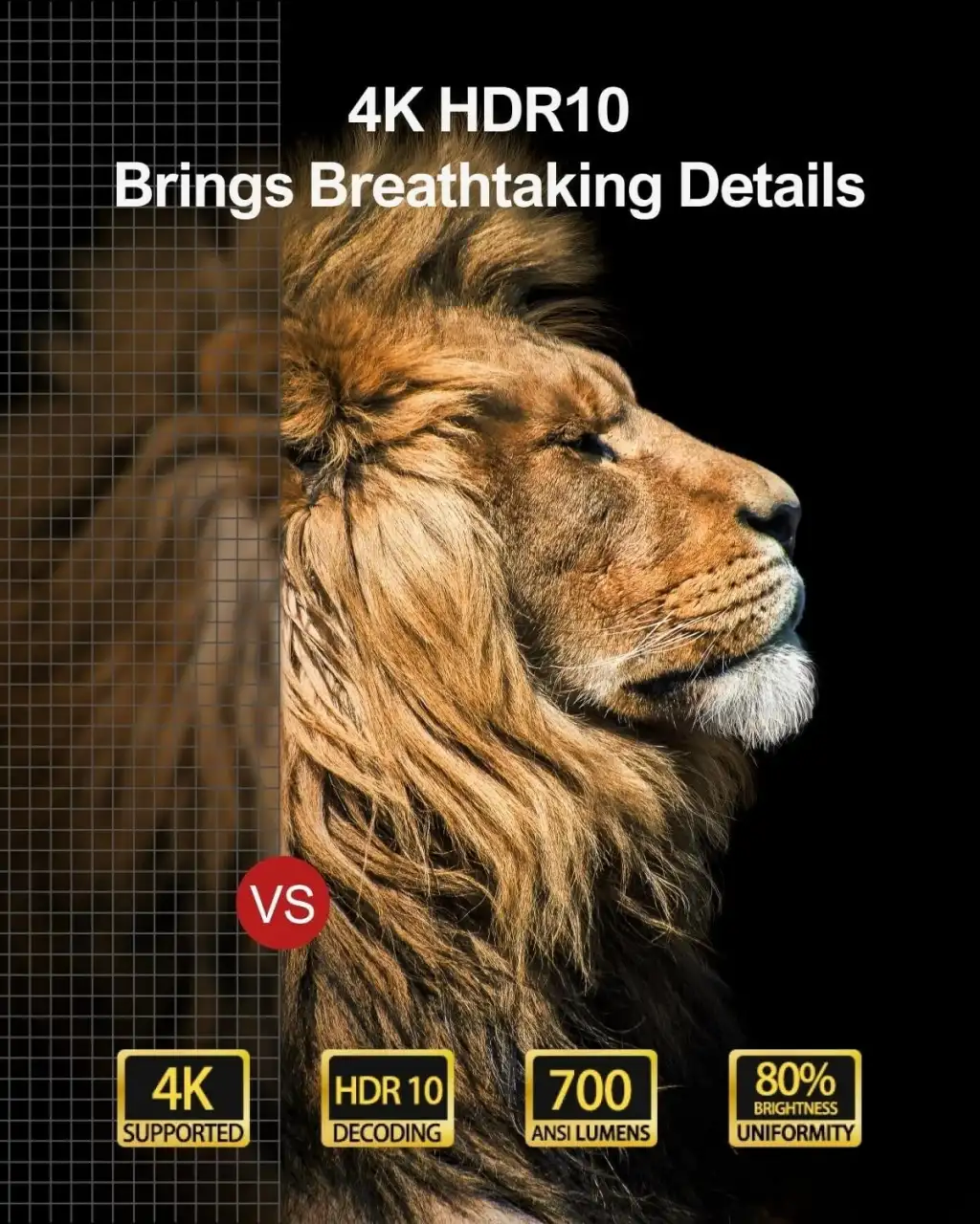 En İyi Bütçe Projektör Yerel 1080P ve Çarpıcı Parlaklık Tekdüzeliği: Apollo P40 Projektör, kullanım ömrü boyunca çarpıcı görüntüler ve doğru renk sağlayan %80 parlaklık tekdüzeliği sunmak için birinci sınıf LCD paneller ve optimize edilmiş optik tasarım kullanır. 4K kod çözme ve HDR10, karanlıkta bile daha ayrıntılı gölgeler geliştirir. Parlak sahneler keskin ve net görünürken, karanlık sahneler derin siyahlarla ayrıntılı kalır. Bulanık kenarlar sizi asla rahatsız etmez, her köşedeki ayrıntılar optimize edilmiştir.