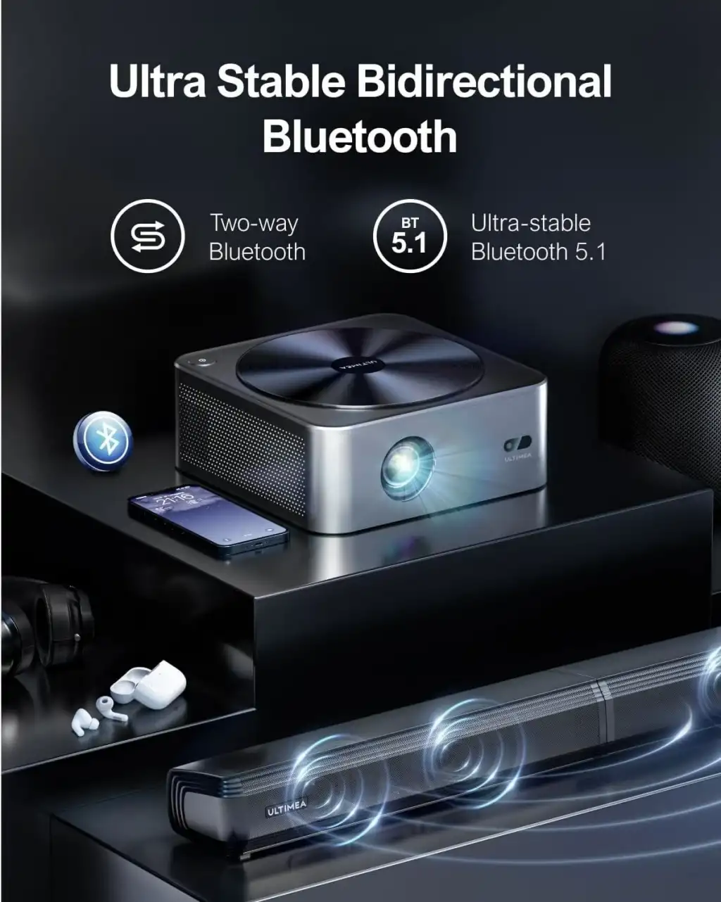 5,8 GHz + 2,4 GHz Çift WiFi ve Çift Yönlü Bluetooth: Ultimea projektör, istikrarlı bağlantı ve düşük giriş gecikmesi için gelişmiş bir wifi anteni ve yonga setine sahiptir. ULTIMEA ses çubukları veya Bluetooth hoparlörlerle kolay senkronizasyon için dahili çift yönlü Bluetooth 5.1. Ek olarak, Bluetooth projektörü ustaca bir özel Bluetooth hoparlöre dönüşebilir. Net tiz ve derin bas üretmek için dahili DSP çipli 10W büyük ses boşluğu hoparlörleri.