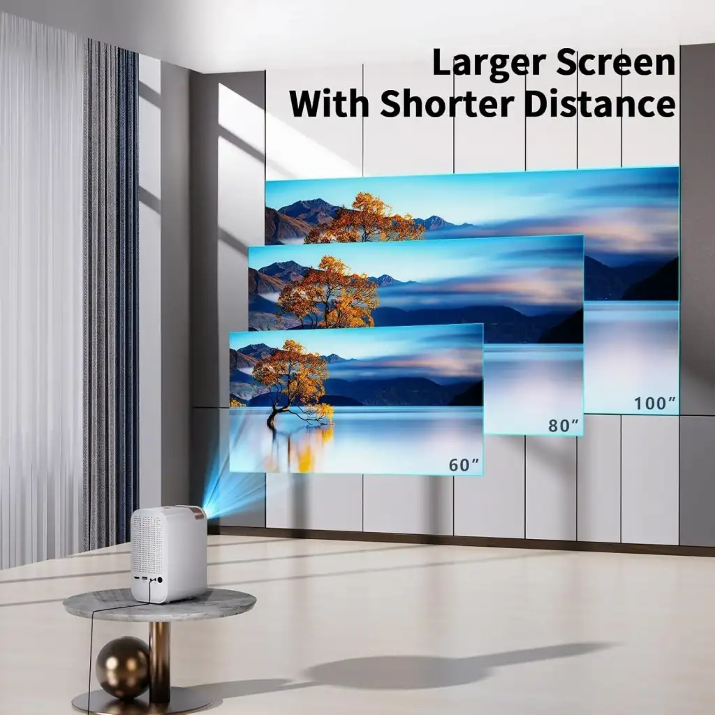 Kısa Odak ve Geniş Ekran: 1,5 metre projeksiyon mesafesinde 100 inç büyük HD ekran sağlayabilen yenilikçi ışık yolu tasarımına sahiptir. Yerel 720P HD Bluetooth projektör, 1080 video oynatmayı destekleyerek sinemada film izliyormuş gibi hissetmenizi sağlar, yüksek çözünürlüklü çizgi filmlerin, anlık spor etkinliklerinin, filmlerin ve belgesellerin keyfini çıkarmanızı sağlar.