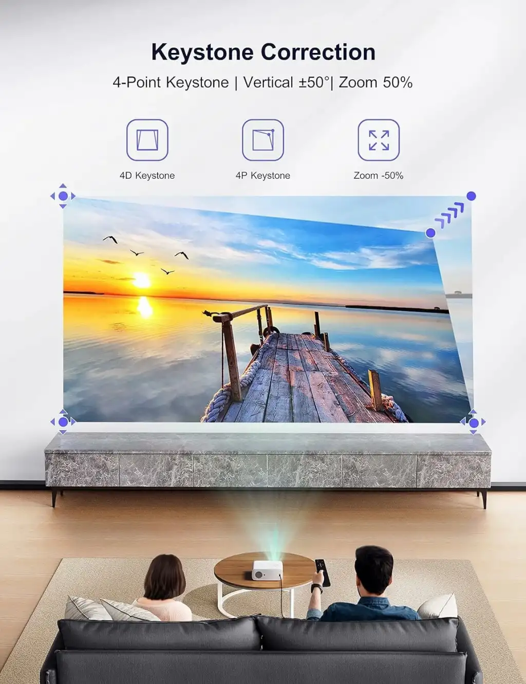 【%50-100 Yakınlaştırma ve 4P/4D Çarpıklık Düzeltmesi】Görüntünün boyutunu ayarlamak için projektörü hareket ettirmenize gerek yoktur. Yakınlaştırma işlevi, görüntü boyutunu aynı yerde %50 - %100 arasında küçültmenize olanak tanır. Projektör, gelişmiş 4D/4P yatay ve dikey düzeltme özelliğine sahiptir ve projektör merkezden uzakta olsa bile yansıtılan görüntüyü dikdörtgen hale getirir.